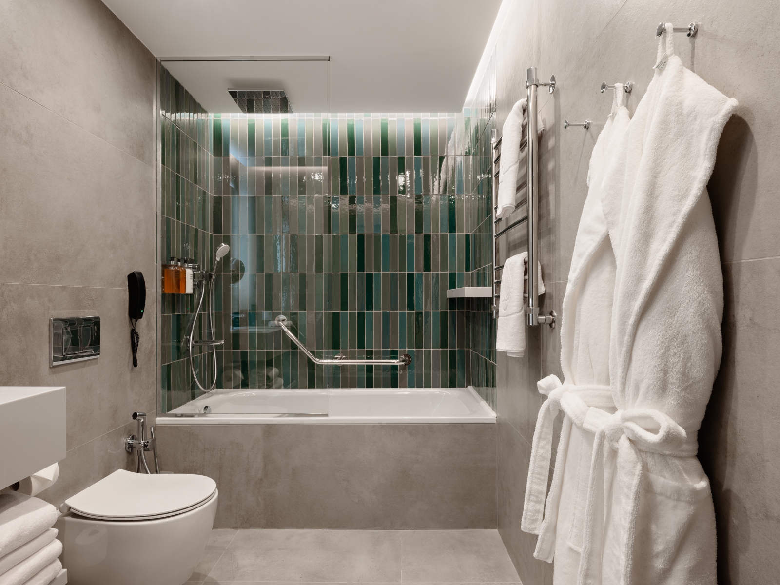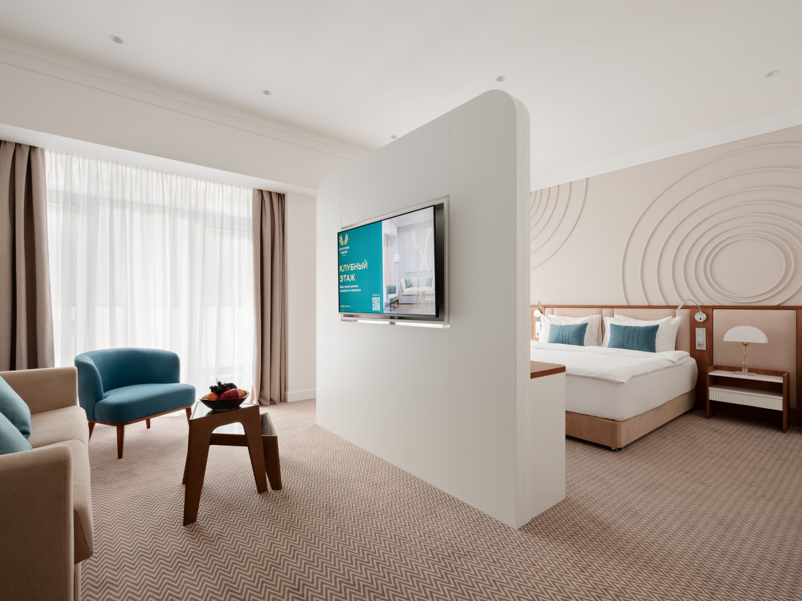 2 осн. места. Балкон. Мебель: вешалка, гардеробная, диван, зеркало, кровати односпальные, кровать двуспальная, прикроватные тумбочки, стол, стулья, шкаф. Оборудование: кондиционер, кофемашина, сейф, телевизор, телефон, чайный набор посуды, электрочайник. Санузел: с ванной, тапочки, туалетные принадлежности, фен, халат. Сервис: Wi-Fi бесплатно, смена полотенец, смена постельного белья, уборка номера, услуги внутренней телефонной связи.
