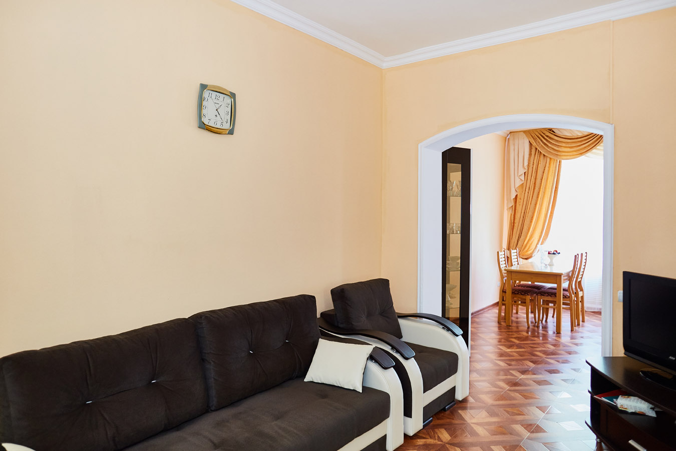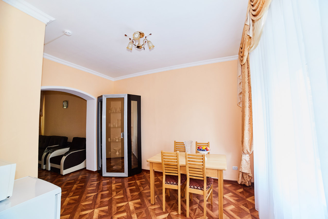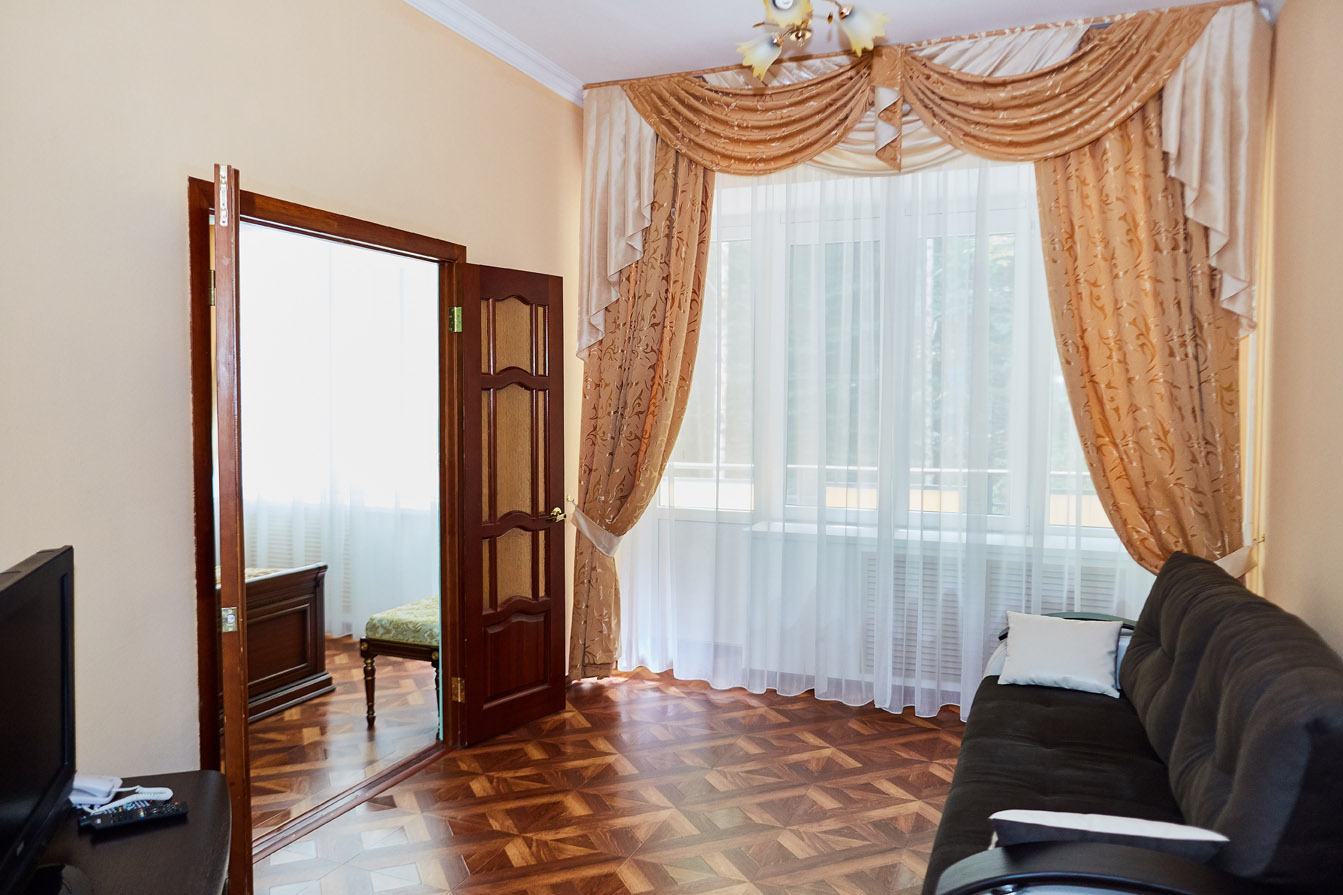Площадь номера - 51,2 кв.м. 2 осн. места. 1 доп. место. Балкон. Мебель: вешалка, диван, зеркало, кресла, кровать двуспальная, прикроватные тумбочки, стол, стулья, шкаф-купе. Оборудование: гладильная доска, микроволновая печь, сейф, телевизор, утюг, холодильник. Санузел: с ванной, туалетные принадлежности, фен. Сервис: смена полотенец, смена постельного белья, уборка номера.
