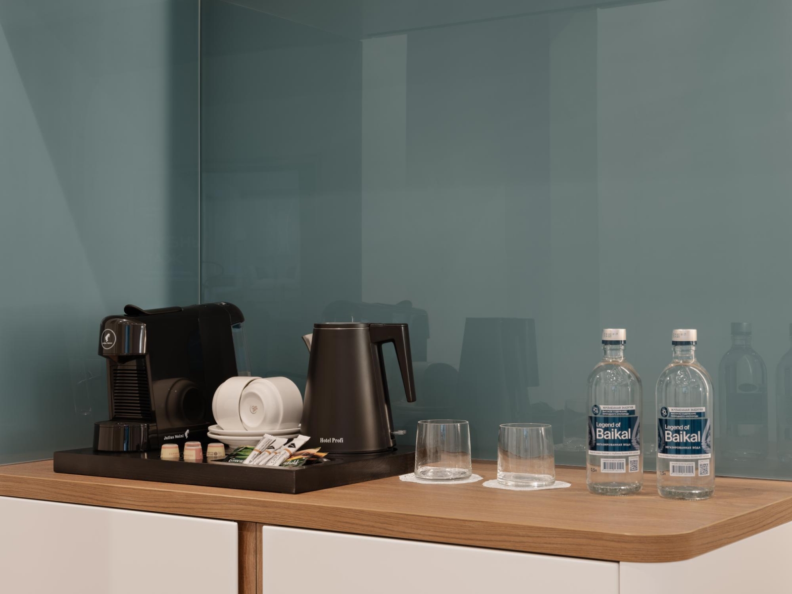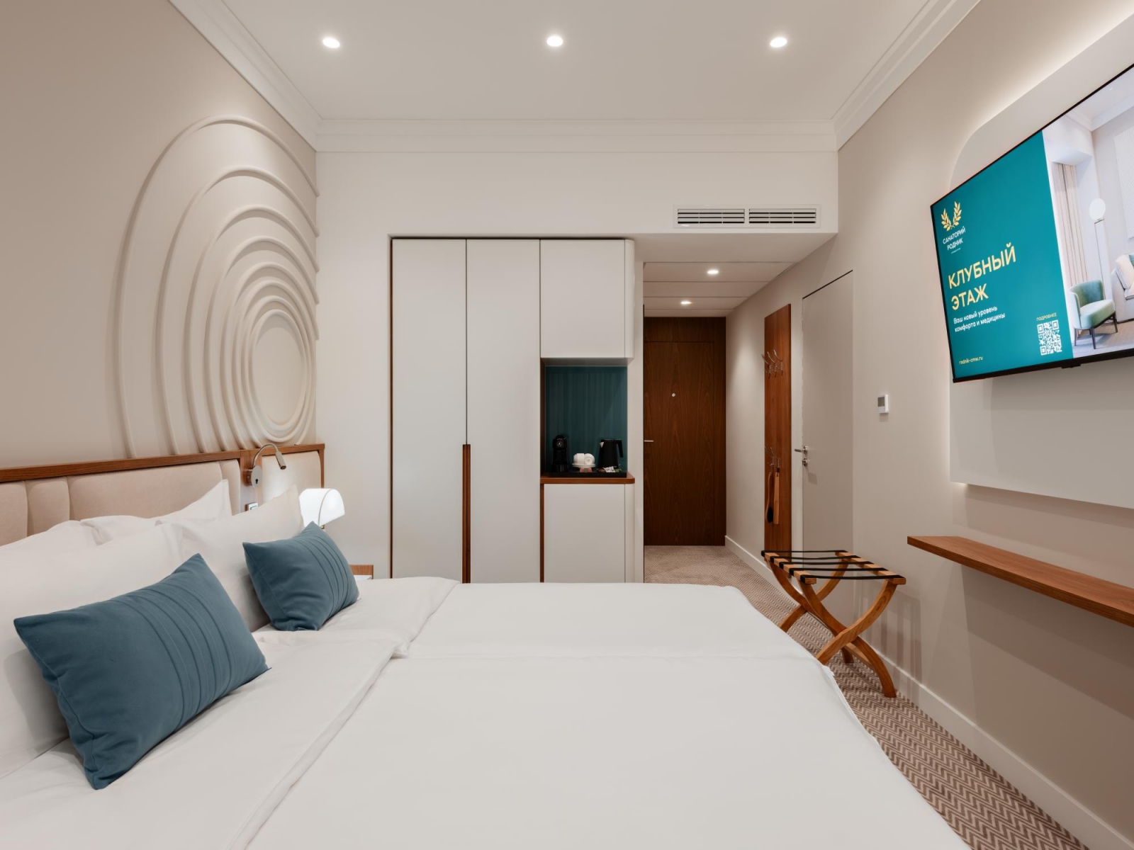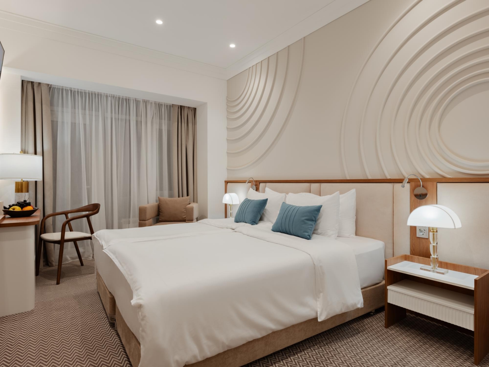 2 осн. места. Мебель: вешалка, зеркало, кровати односпальные /одна двуспальная кровать, прикроватные тумбочки, стол, стулья, шкаф. Оборудование: кондиционер, сейф, телевизор, телефон, чайный набор посуды, электрочайник. Санузел: с душем, тапочки, туалетные принадлежности, фен, халат. Сервис: Wi-Fi бесплатно, смена полотенец, смена постельного белья, уборка номера, услуги внутренней телефонной связи.